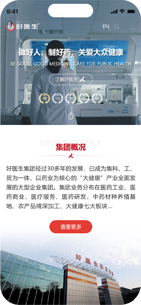 好医生药业集团有限公司经过30多年的发展,已成为集科、工、贸为一体,以生物医药为核心的“大健康”产业全面发展的大型企业集团。集团业务分布在医药工业、医药商业、医药研发、医疗、中药材种养殖基地、农产品现代加工、大健康七大板块,下属37家全资子公司,1家互联网医疗平台公司,3家医贸公司,分布在四川、云南、山西、辽宁、贵州等省,有员工20000多名。